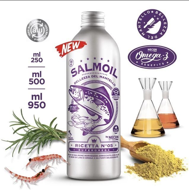 Esta receta también se llama SUPER-OMEGA por la riqueza en ácidos grasos Omega 3 y la proporción óptima entre Omega 3 y Omega 6. Mantiene la piel y el pelaje brillantes